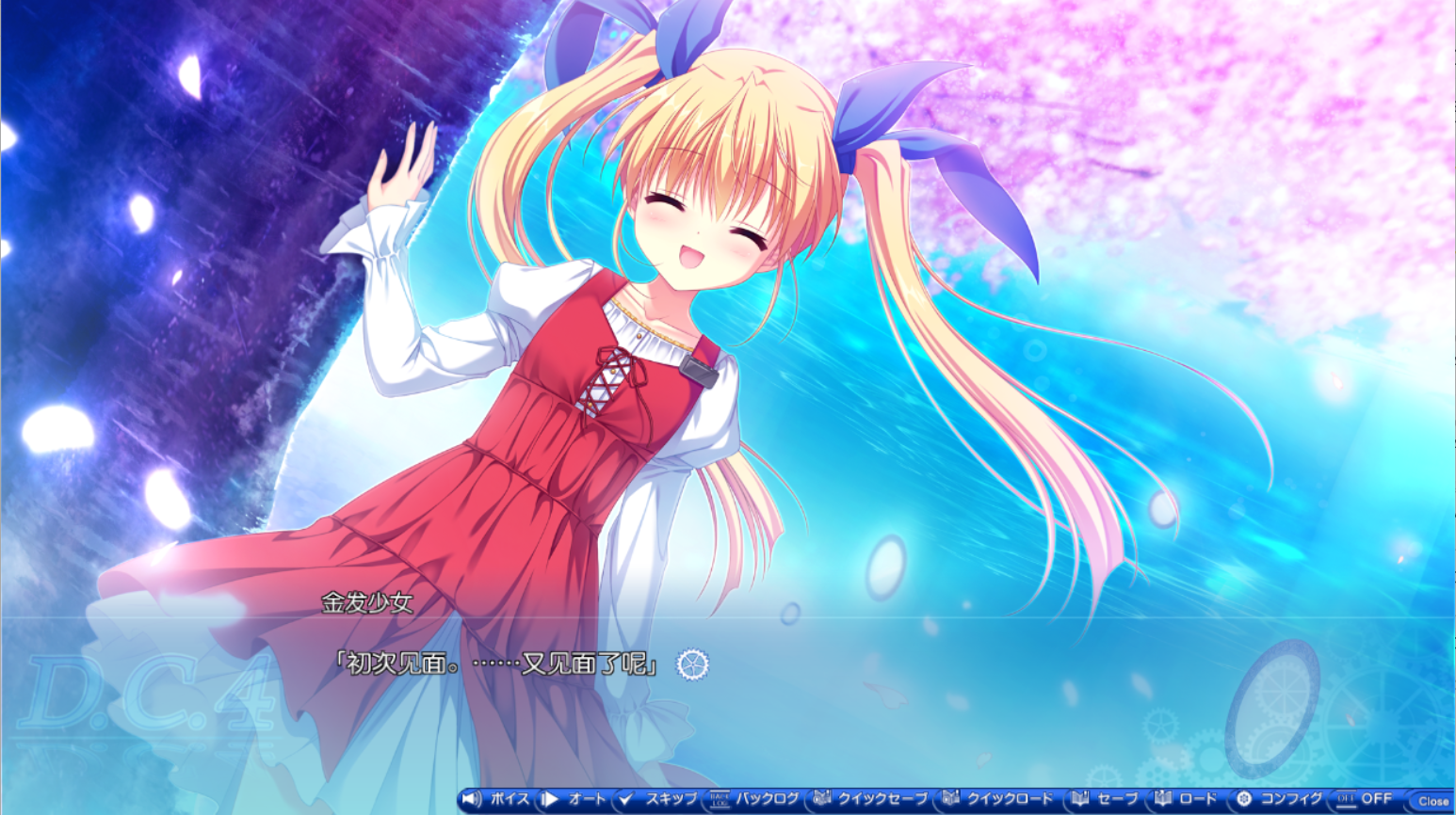 D.C.4是我玩过的第一部DC。当D.C.结局中一个双马尾的红衣金发萝莉出来跟我说一些不知所谓的谜语的时候,我的确感受到了老资历的气息。毕竟初音岛系列历来已久名声在外——啊想必等我啃完全系列我一定能体会到这份情怀与感动吧——而群里的老资历虽然没玩过D.C.4,也还是强烈建议我麻溜点去玩初代。
